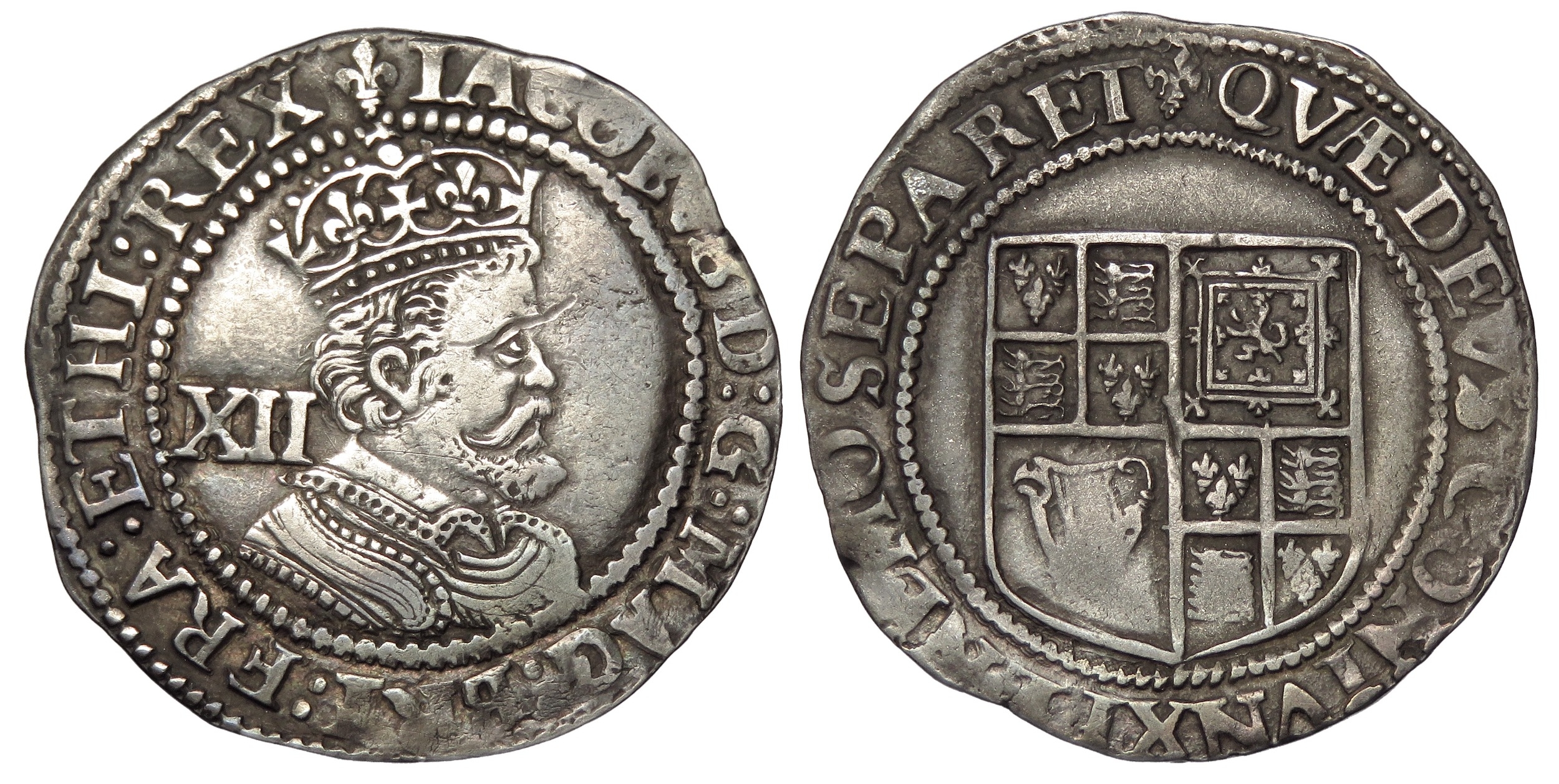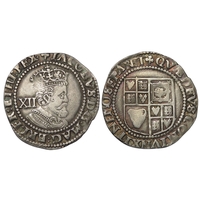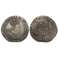 James I shilling, third coinage, 1619-25 AD. i.m, lis. Sixth (large) bust. Silver, 5.8g. Ref: S.2668. British Museum coin number, 576. From the "Battle of Aylesbury" hoard. Ref: 2023 T349. PAS: BUC-D73196.