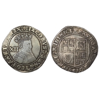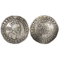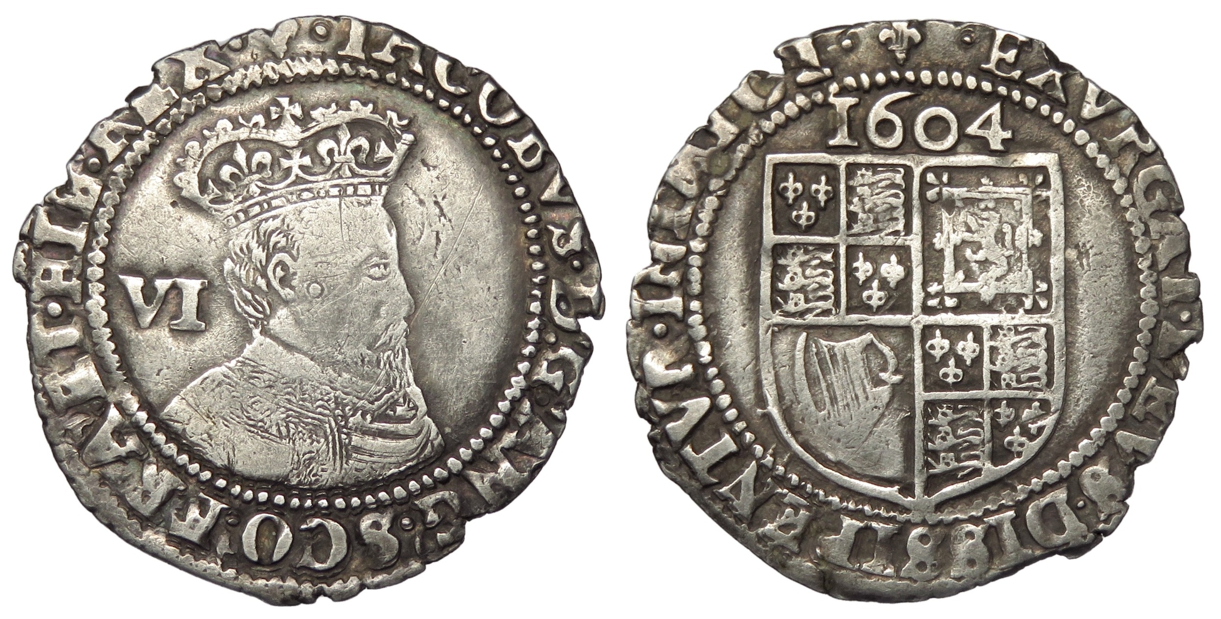 James I sixpence, first coinage, 1603-4 AD. i.m, lis. Second bust. Silver, 3.0g. Ref: S.2648. British Museum coin number, 479. From the "Battle of Aylesbury" hoard. Ref: 2023 T349. PAS: BUC-D73196.