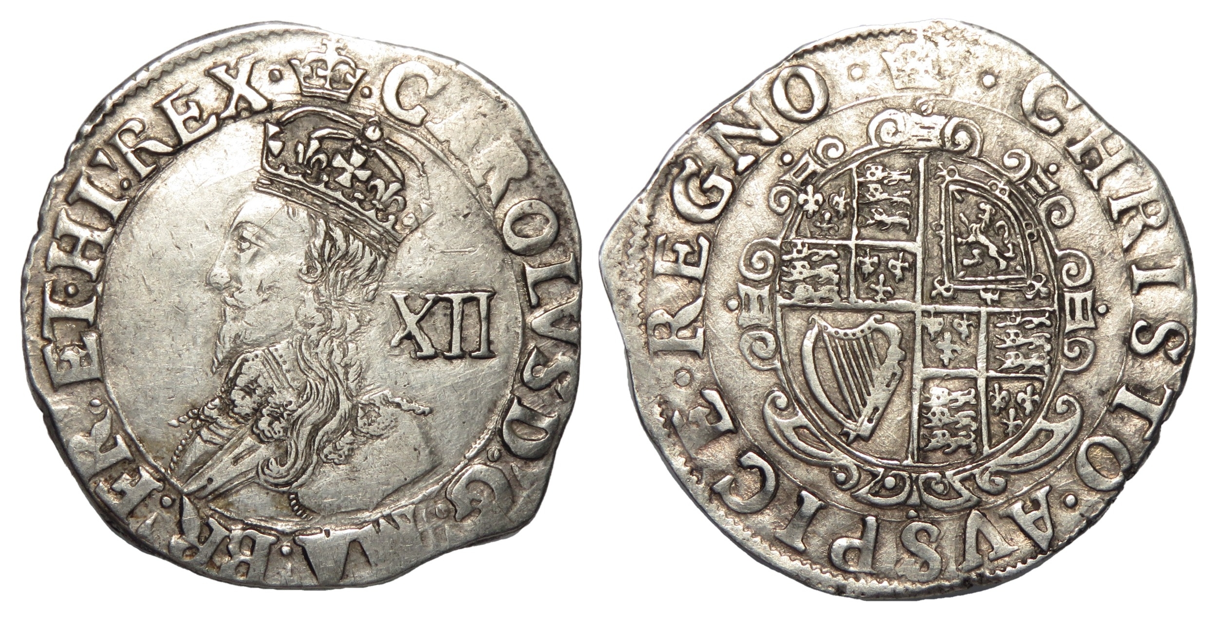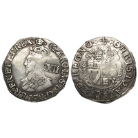 Charles I shilling, 1635-1636. Silver, 5.94g. i.m, crown. Group D, type 3a. Ref: S.2791. British museum coin number, 726. From the "Battle of Aylesbury" hoard. Ref: 2023 T349. PAS: BUC-D73196.