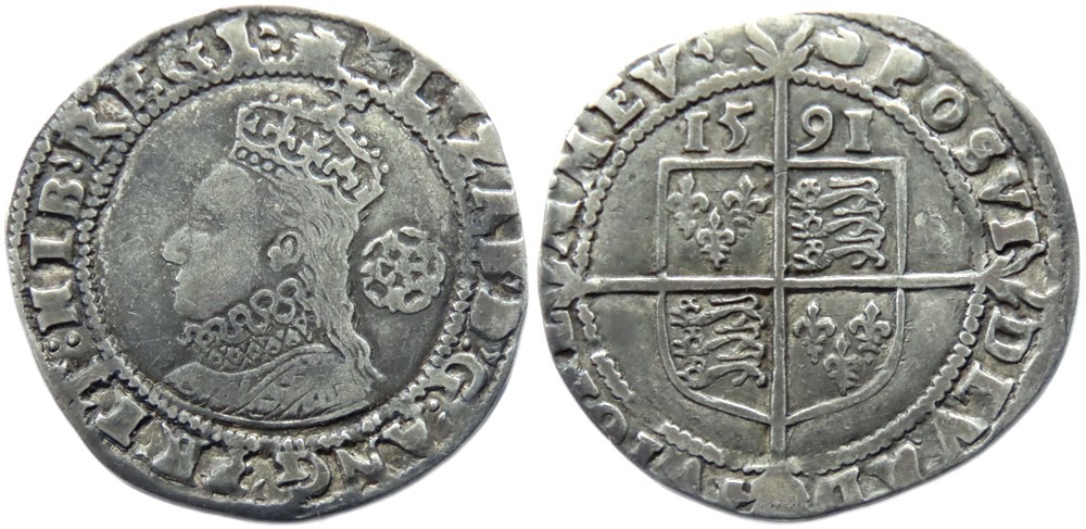 Elizabeth I sixpence, sixth issue 1582-1600 AD. i.m, hand, 1591. Bust 6c. Silver, 2.88g. Ref: S.2578B. British Museum coin number, 293. From the "Battle of Aylesbury" hoard. Ref: 2023 T349. PAS: BUC-D73196.