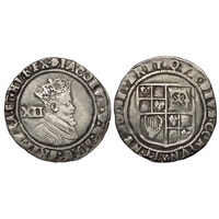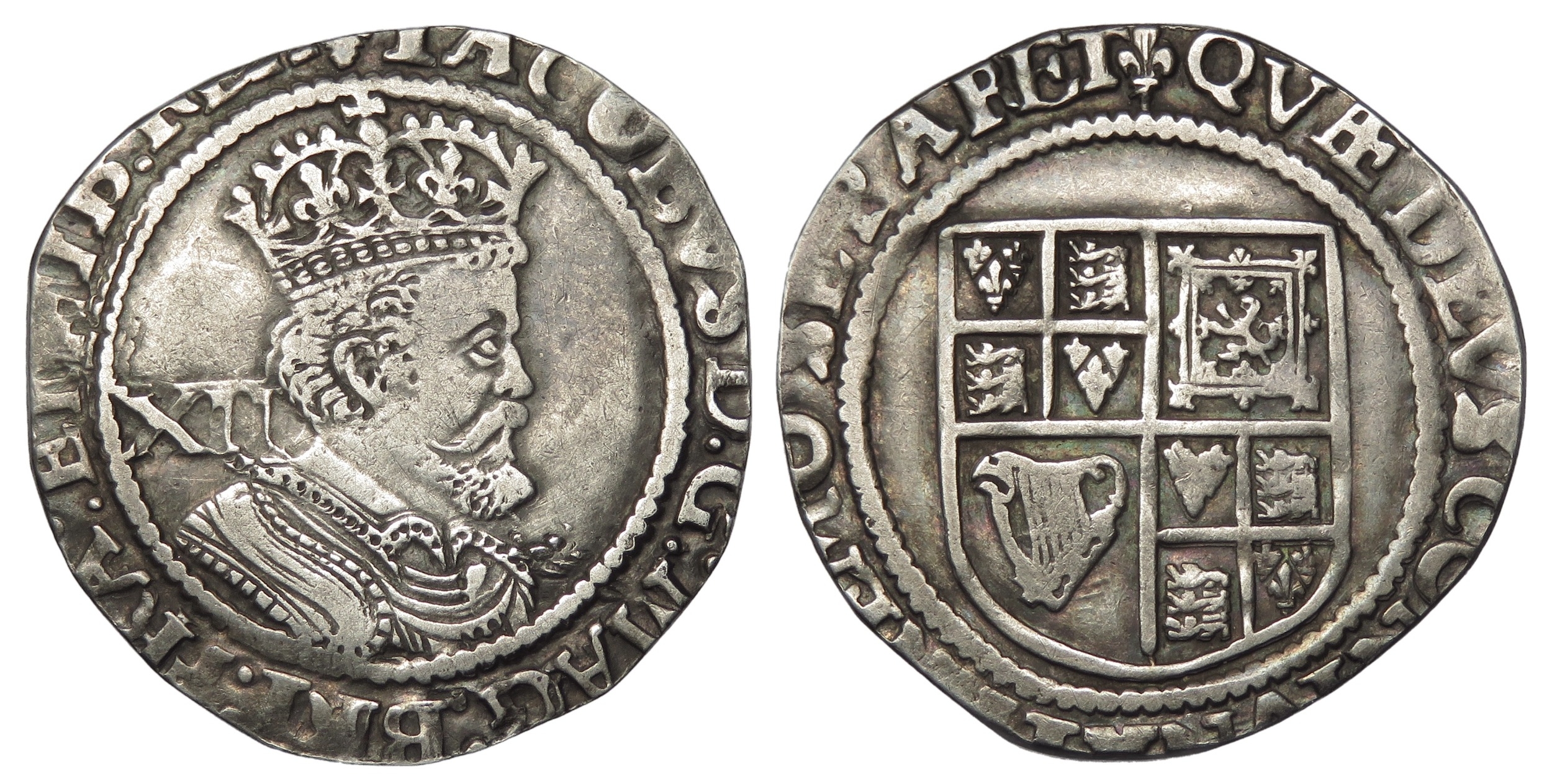 James I shilling, third coinage, 1619-25 AD. i.m, lis. Sixth (large) bust. Silver, 5.1g. Ref: S.2668. British Museum coin number, 580. From the "Battle of Aylesbury" hoard. Ref: 2023 T349. PAS: BUC-D73196.