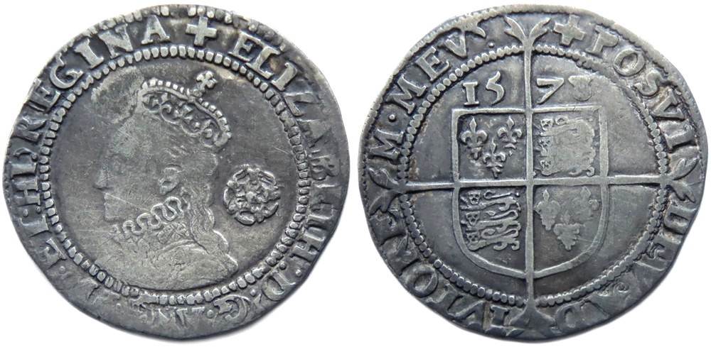 Elizabeth I sixpence, fifth issue 1578-82 AD. i.m, Greek cross, 1578. Silver, 2.89g. Ref: S.2572. British Museum coin number, 201. From the "Battle of Aylesbury" hoard. Ref: 2023 T349. PAS: BUC-D73196.