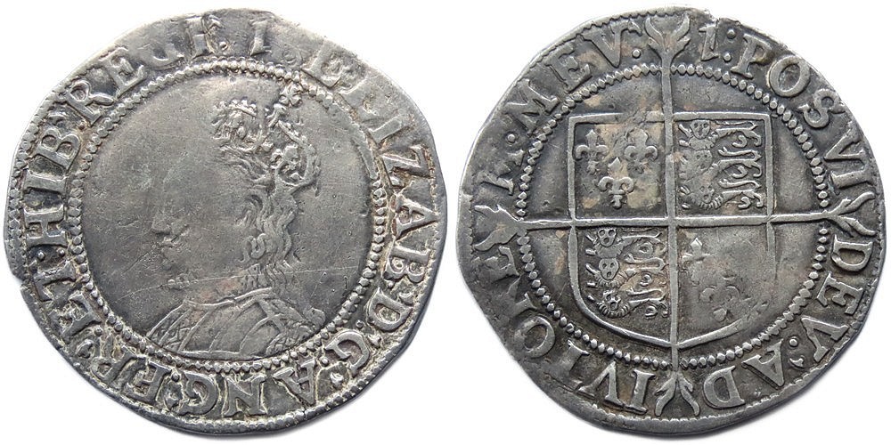 Elizabeth I shilling, seventh issue 1601-2 AD. i.m, 1. Silver, 5.77g. Ref: S.2584. British Museum coin number, 453. From the "Battle of Aylesbury" hoard. Ref: 2023 T349. PAS: BUC-D73196.