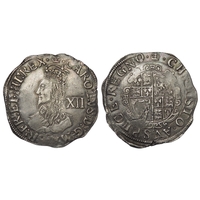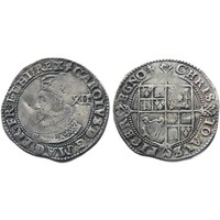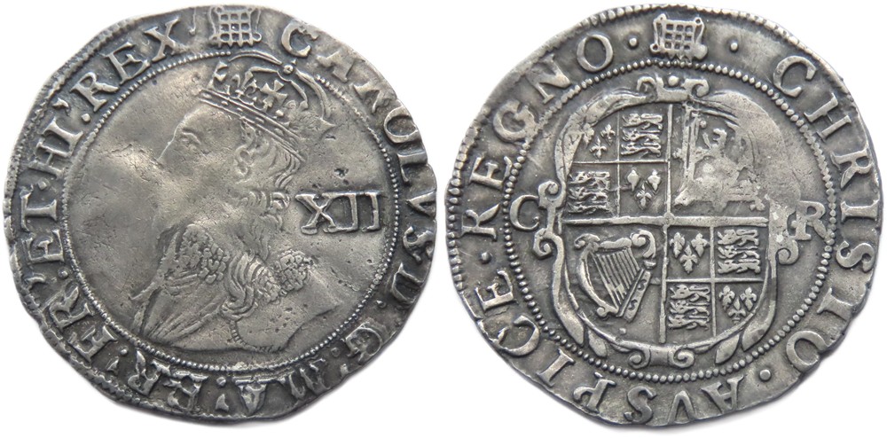 Charles I shilling, 1633-4 AD. Group D, type 3.1. i.m, portcullis. Silver, 5.88g. Ref: N2223, S.2789. British Museum coin number, 687. From the "Battle of Aylesbury" hoard. Ref: 2023 T349. PAS: BUC-D73196.