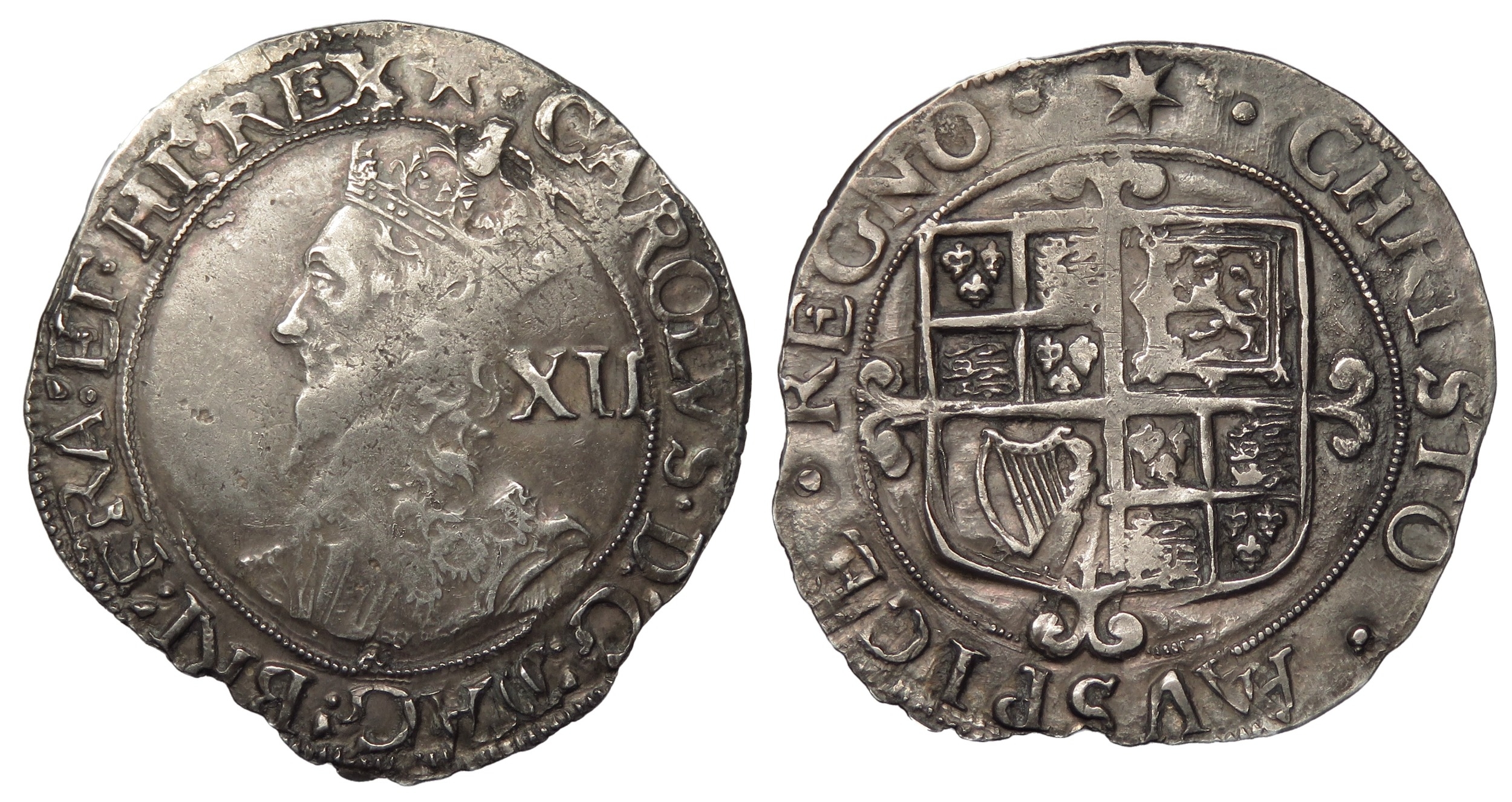 Charles I shilling, 1640-1 AD. i.m, star. Group F, type 4.4. Silver, 5.7g. Ref: S.2799. British Museum coin number, 896. From the "Battle of Aylesbury" hoard. Ref: 2023 T349. PAS: BUC-D73196.