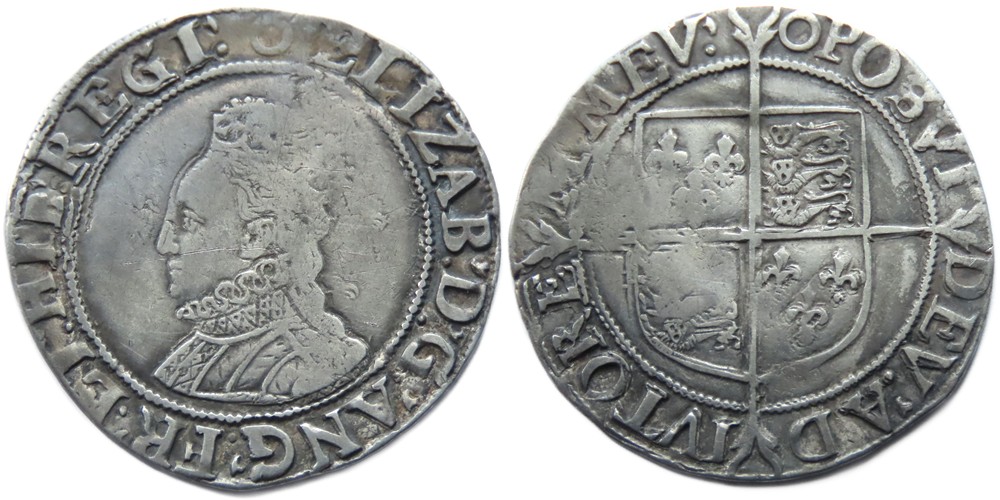 Elizabeth I shilling, sixth issue 1582-1600 AD. i.m, 0. Silver, 6.02g. Ref: S.2577. British Museum coin number, 452. From the "Battle of Aylesbury" hoard. Ref: 2023 T349. PAS: BUC-D73196.