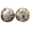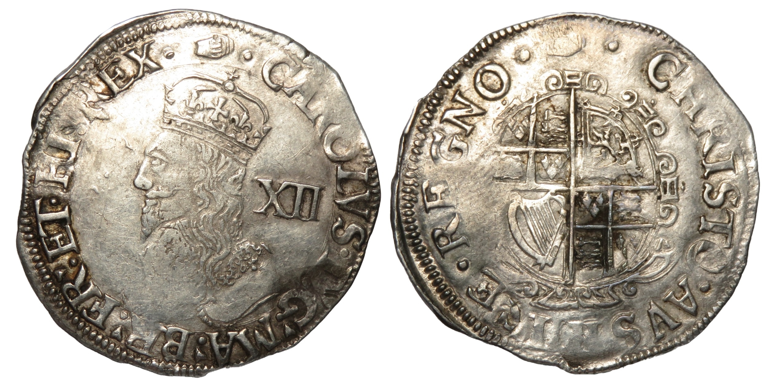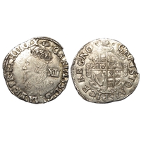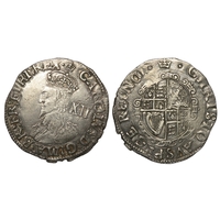 Charles I shilling, 1635-1636. Silver, 5.8g. i.m, tun. Group D, type 3a, rare bust veriety. Ref: S.2791. British museum coin number, 753. From the "Battle of Aylesbury" hoard. Ref: 2023 T349. PAS: BUC-D73196.