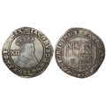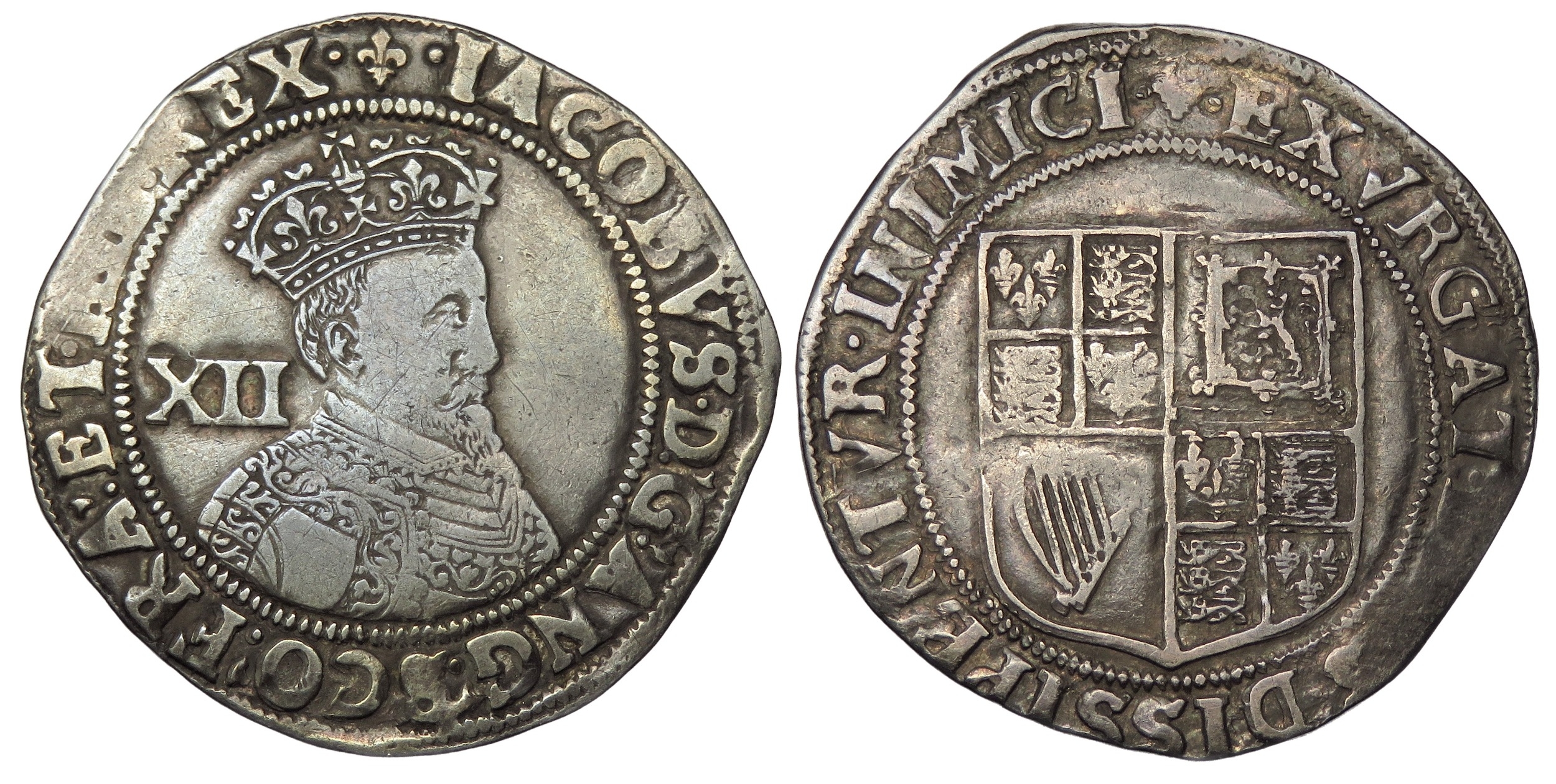 James I shilling, first coinage, 1603-4 AD. i.m, lis. Second bust. Silver, 5.9g. Ref: S.2646. British Museum coin number, 514. From the "Battle of Aylesbury" hoard. Ref: 2023 T349. PAS: BUC-D73196.
